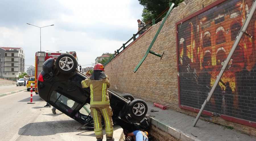 Bursa'da köprülü kavşaktaki virajı alamayan kadın sürücü, demir korkulukları aşarak aşağı uçtu. Kaldırımda yürüyen yaşlı adam uçan aracın altında kalmaktan son anda kurtuldu.