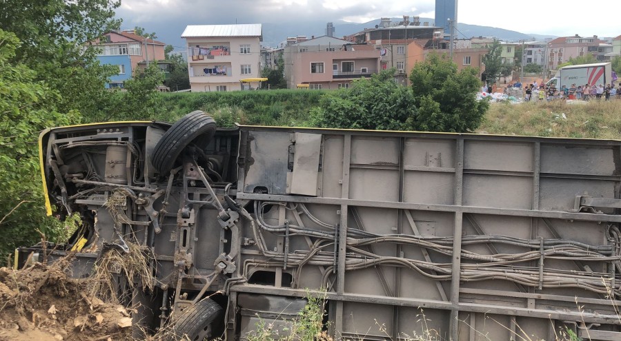 Kaza sebebiyle olay yerine çok sayıda ekip sevk edildi Alınan bilgiye göre, merkez Osmangazi İlçesi Panayır Mahalllesi Dereyolu Caddesi'nde öğle saatlerinde meydana gelen kazada Tuğrul A. idaresindeki 16 TAT 70 plakalı belediye otobüsü ağaca çarpıp yan yattı.