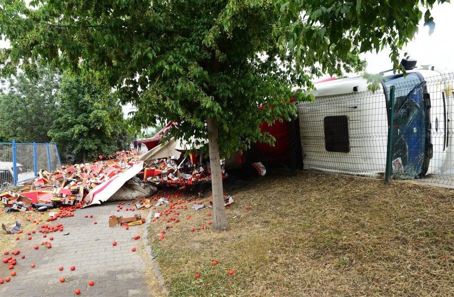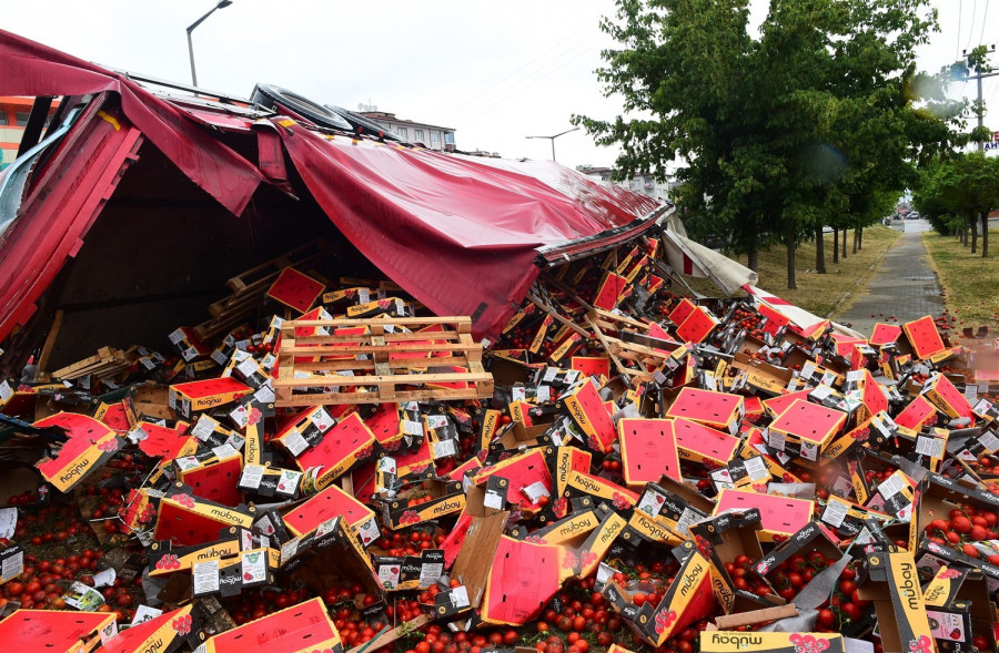 Bursa'nın Orhangazi ilçesinde otomobile çarptıktan sonra yan yatan tırın kasasındaki tonlarca domates yola saçıldı.