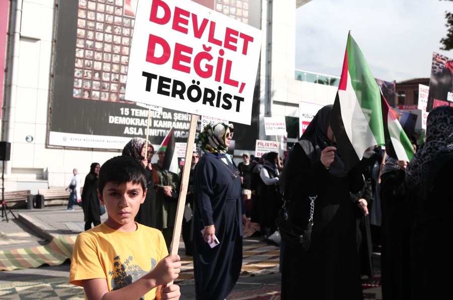 İsrail-Filistin savaşında şiddet tırmanmaya devam ederken Bursa Kadın Gönüllü Kuruluşları, savaşta zarar gören sivil halk için sessiz oturma eylemi yaptı. İsrail'in Gazze'deki hastane ve okulları vurduğunu söyleyen kadınlar savaşın bir an önce durmasını istedi.
