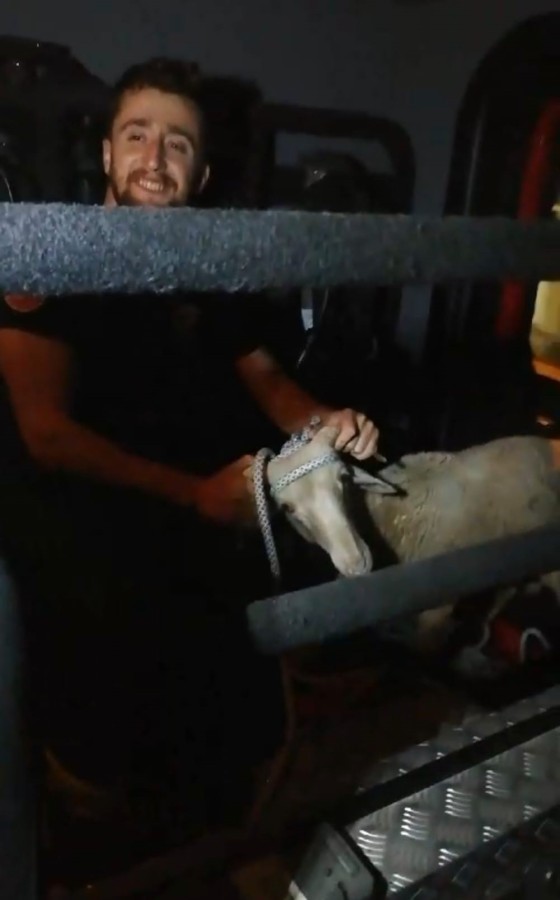 Olay yerine gelen ekipler, halatla mahsur kalan koyunu kurtardı.