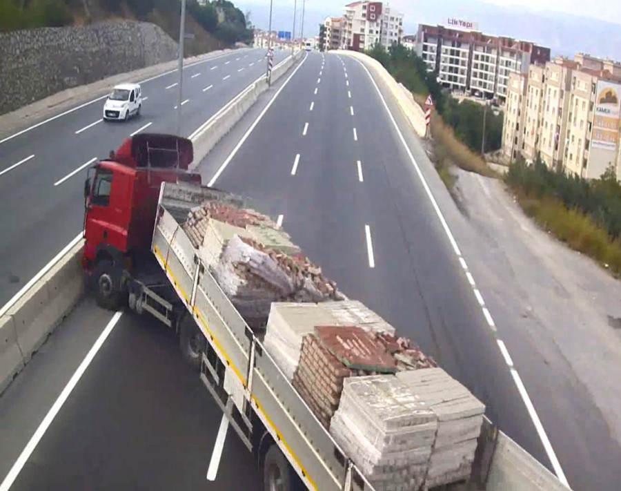 Görüntülerde Mudanya istikametine doğru seyir halinde olan bir tırın frenleri patladı. Bunun üzerine sürücü tırı beton bariyerlere sürdü. Yağmurlu yolda direksiyon hakimiyetini kaybeden sürücü karşı şeritteki beton bariyerlere çarpıp, Bursa istikametine çıktı. Bu sırada yoldan geçen motosiklet ve bir araç sürücüsü ölümden döndü.