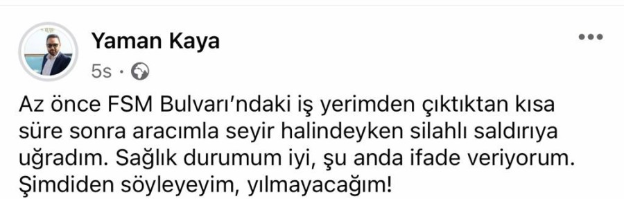 Yaşadığı olayın ardından sosyal medya hesabından yaptığı açıklamada Yaman Kaya, "Az önce (FSM) Bulvarı'ndaki iş yerimden çıktıktan kısa süre sonra aracımla seyir halindeyken silahlı saldırıya uğradım. Sağlık durumum iyi, şu anda ifade veriyorum. Şimdiden söyleyeyim, yılmayacağım" ifadelerine yer verdi.