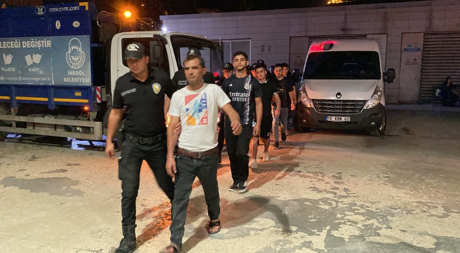 İnegöl Emniyet Müdürlüğü ekipleri, Yenice Mahallesi Kelmehmet Sokak üzerinde bir adrese gürültü ihbarı nedeniyle gitti. Eve giren polis ekipleri, evde 10 yabancı uyruklu şahsın olduğunu tespit etti. Yapılan incelemede 10 yabancı uyruklu şahsın kimliklerinin olmadığı öğrenilirken, şahıslar polis ekiplerince gözaltına alındı.