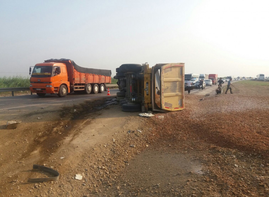 Alınan bilgiye göre, İstanbul-Bursa-İzmir otoyolu inşaatı için Karacabey'de bulunan şantiye alanına hafriyat taşıyan Sedat Yıldırım (40) yönetimindeki 16 BCC 13 plakalı kamyon, Uluabat Mahallesi yakınlarında refüje devrildi.