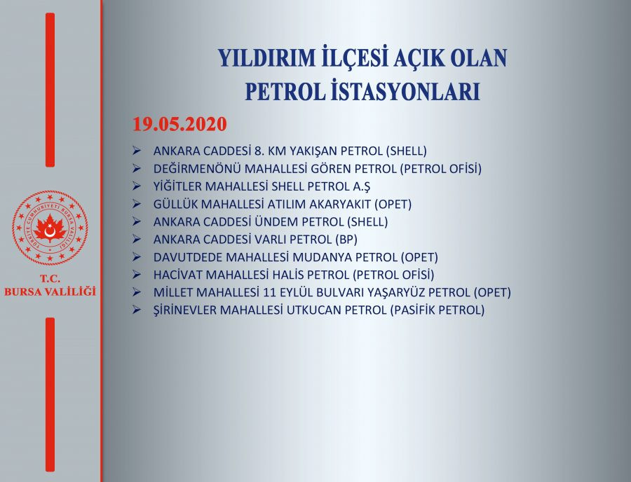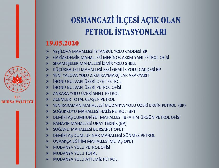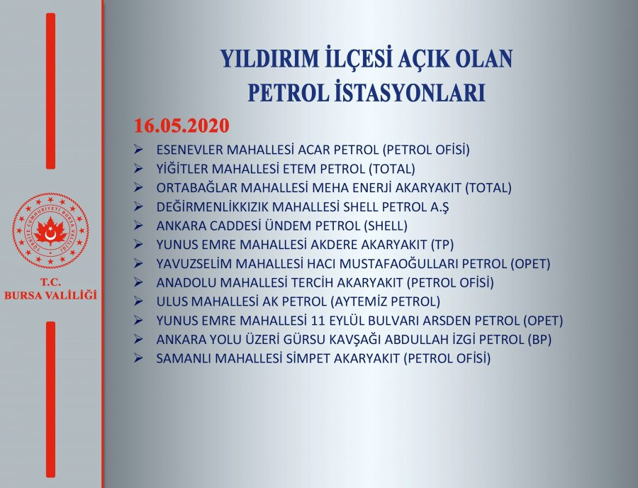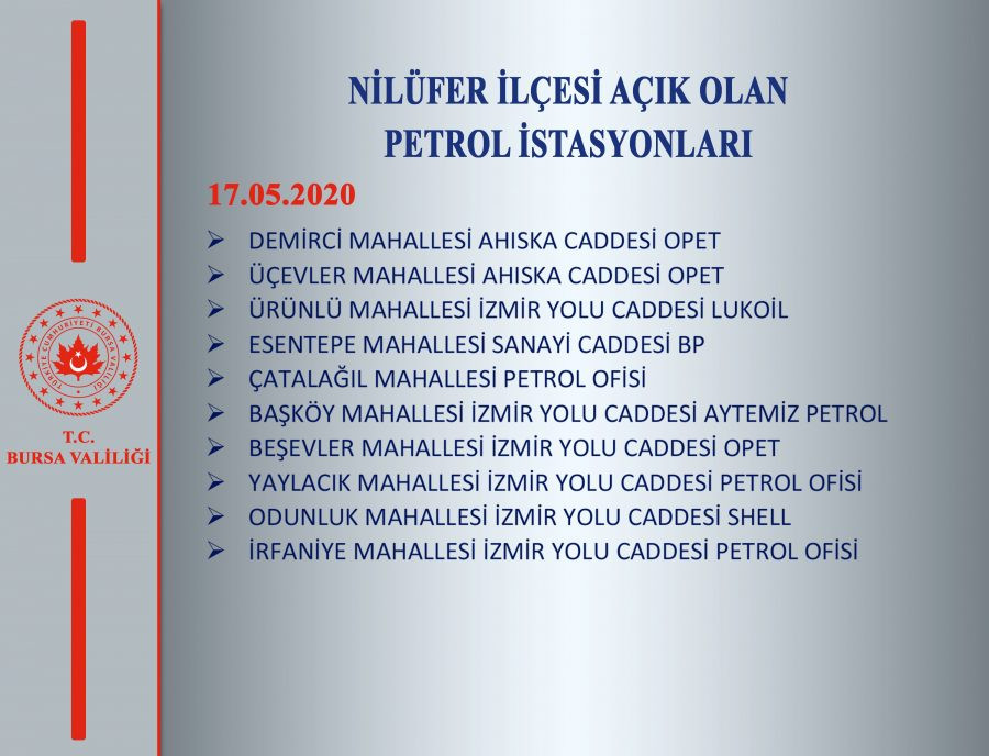 Bursa Valiliği'nden yapılan açıklamaya göre açık olacak olan benzin istansyonları: