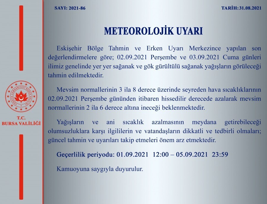 Eskişehir Bölge Tahmin ve Erken Uyarı Merkezince yapılan son değerlendirmelere göre; 02.09.2021 Perşembe ve 03.09.2021 Cuma günleri ilimiz genelinde yer yer sağanak ve gök gürültülü sağanak yağışların görüleceği tahmin edilmektedir. Mevsim normallerinin 3 ila 8 derece üzerinde seyreden hava sıcaklıklarının bugünden itibaren hissedilir derecede azalarak mevsim normallerinin 2 ila 6 derece altına ineceği beklenmektedir. Yağışların ve ani sıcaklık azalmasının meydana getirebileceği olumsuzluklara karşı ilgililerin ve vatandaşların dikkatli ve tedbirli olmaları; güncel tahmin ve uyarıları takip etmeleri önem arz etmektedir"