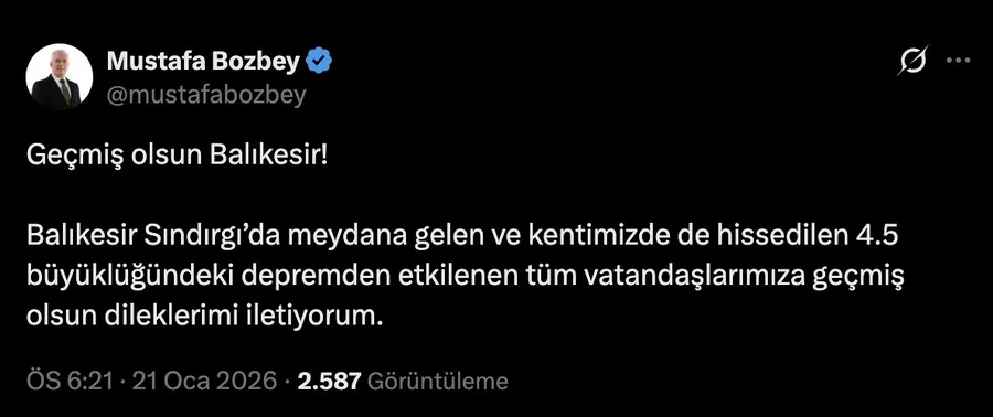 Bozbey açıklamasında, "Balıkesir Sındırgı'da meydana gelen ve Bursa'da da hissedilen 4.5 büyüklüğündeki depremden etkilenen tüm vatandaşlarımıza geçmiş olsun. Gelişmeleri yakından takip ediyoruz" ifadelerini kullandı.