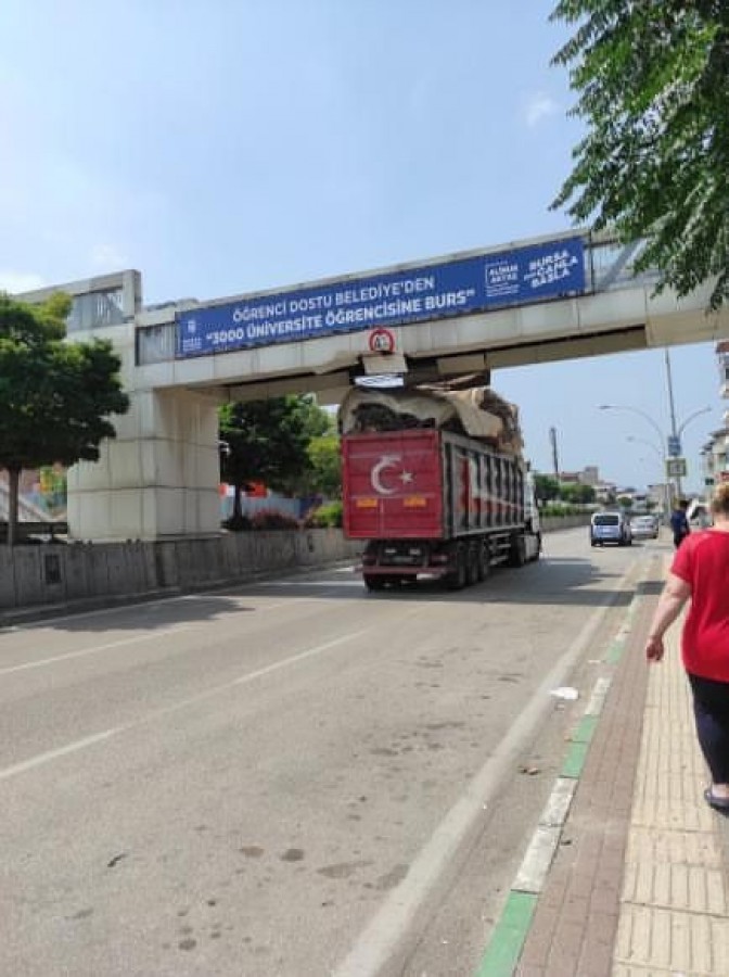 Diğer bir görüntüde ise tır, dorse yüksekliğini hesap edemeyerek üst geçide çarptı.