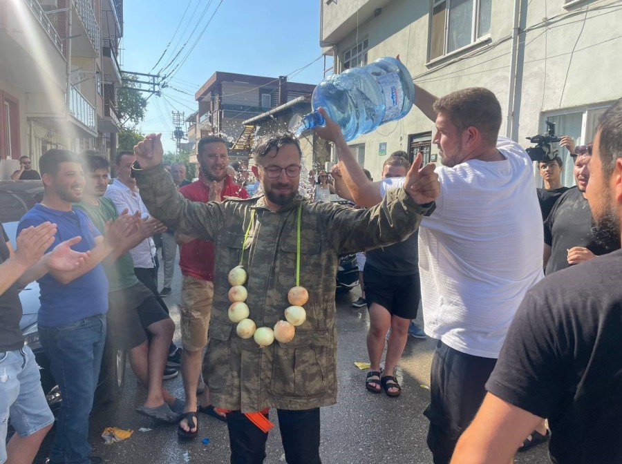 İznik ilçesinde evlenecek damatlara uygulanan geleneklerden Mustafa Akın da nasibini aldı.