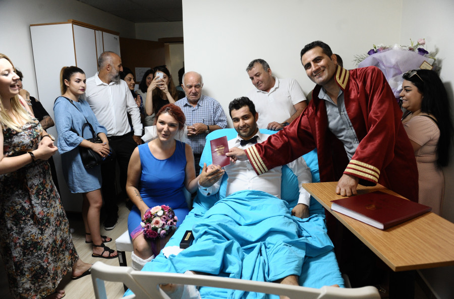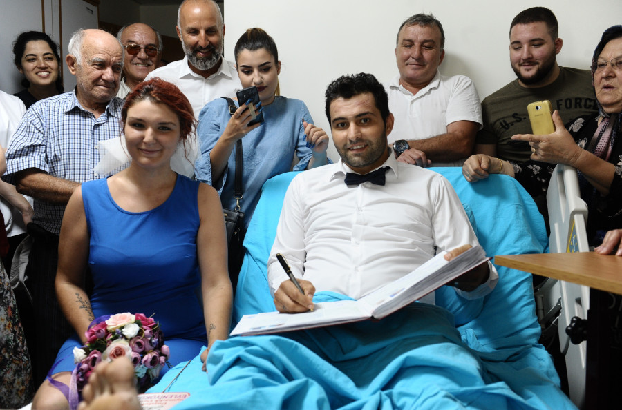 Hastaneye gelen nikah memuru, alçıda bulunan genç çiftin nikahını yatak üstünde kıydı. Nikaha çiftin yakınlarının yanı sıra hastane çalışanları katıldı. Çiftin nikah şahitleri ise günlerce bakımlarını üstlenen hemşireler oldu.