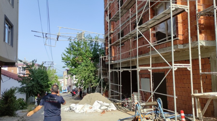 Bursa'nın Orhangazi ilçesinde bir inşaatın dördüncü katında sıva işi yapan işçinin üzerinde olduğu iskele, bina yanından geçen yüksek gerilim hattı tellerinin üzerine devrildi. İşçi son anda kendisini inşaatın 3. katına atarak kurtuldu.