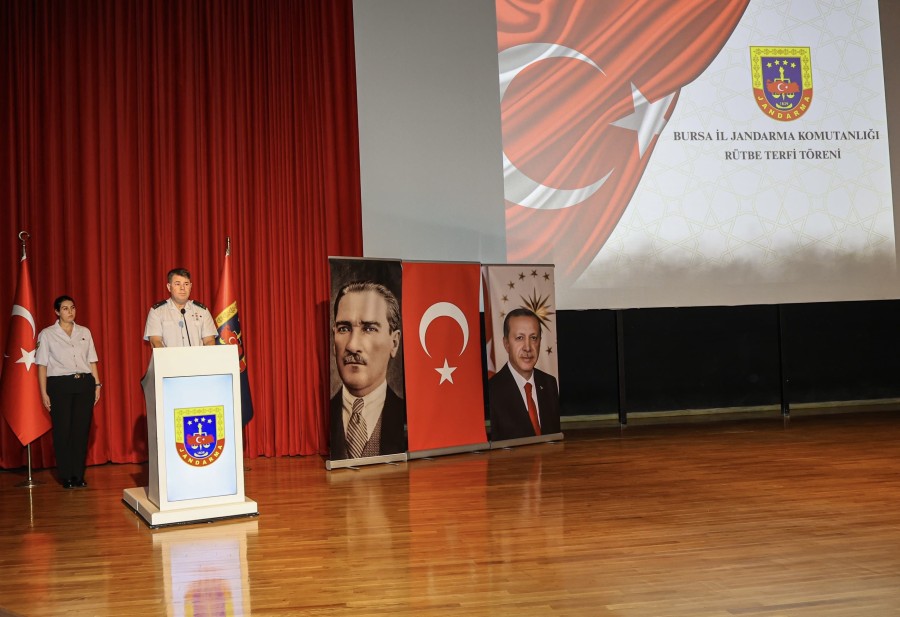 Bursa İl Jandarma Komutanlığı'nda görev yapan personelin rütbe terfi töreni, Bursa Valisi Erol Ayyıldız, il protokolü ve personelin ailelerinin katılımıyla gerçekleştirildi. Uludağ Üniversitesi Prof. Dr. Mete Cengiz Kültür Merkezi'nde düzenlenen törende bir üst rütbeye yükselen jandarma personeline yeni rütbeleri takdim edildi. Terfi eden personeli tebrik eden Vali Ayyıldız, jandarmanın fedakârca görev yaptığını vurgulayarak başarılarının devamını diledi.