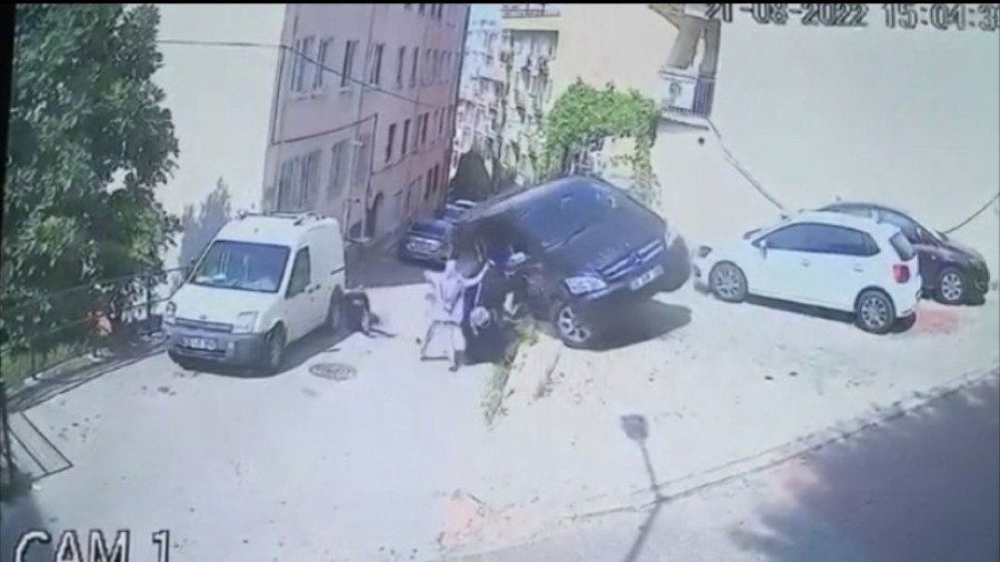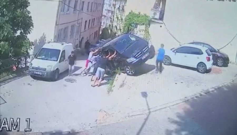Bursa'da VIP minibüs park halindeyken harekete geçti. Sürücüsü altında kalmaktan takla atarak ve sürünerek kurtuldu. Minibüsten inme aşamasındaki kadınlar da banketten düşüp takla atacak aracı tutup kazayı önledi. O anlar saniye saniye güvenlik kamerasına yansıdı.