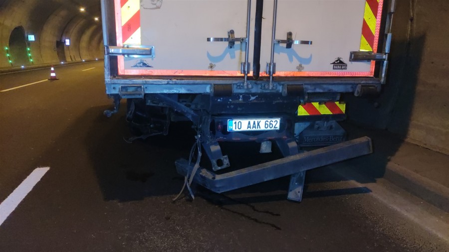 Kaza saat 24.00 sıralarında Gebze-Orhangazi-İzmir otoyolunun Orhangazi tüneli içinde meydana geldi. Alınan bilgilere göre Bursa'dan İstanbul istikametine doğru gitmekte olan D.D.Ö. (27) idaresindeki 34 JR 2704 plakalı otomobil, aynı yönde gitmekte olan M.D. (46) idaresindeki 10 AAK 662 plakalı kamyona arkadan çarptı. Kamyona arkadan çarpan otomobilin tavanı parçalandı. Otomobil hurdaya dönerken, genç sürücü kazayı şans eseri yara almadan atlattı. Kazanın dehşetini ise, otomobilin çarpmasıyla kopan kamyon lastiği gözler önüne serdi.
