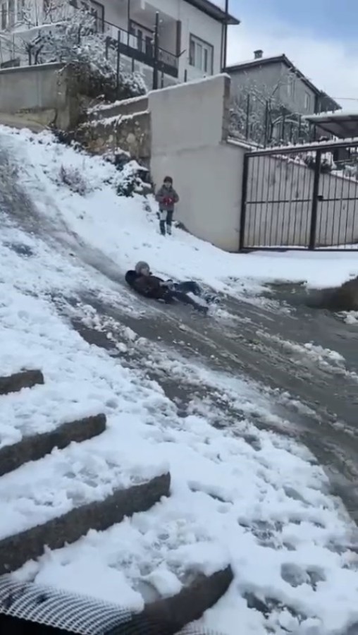 Kar yağışına hazırlıksız yakalanan sürücüler zor anlar yaşarken çocuklar ise bu durumu fırsata çevirdi.