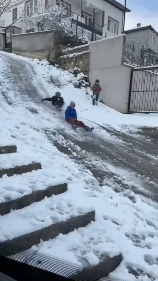 Bursa'da dün şehir merkezinde kar yağışı etkisi göstermesiyle beraber çocuklar sokaklara akın ederek poşetlerler kaydı ve karın tadını çıkardı.
