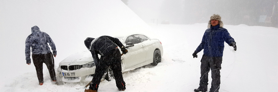Kış turizminin gözde merkezlerinden Uludağ'da kar kalınlığı 50 santimetreye ulaşırken, kar yağışı zirve yolunda da etkili oldu. Günübirlik Uludağ’a çıkmak isteyen sürücüler, araçlarına zincir takarak yollarına devam ederken, bazı sürücüler ise yoğun tipi sebebiyle zor anlar yaşadı. Lüks araçlarıyla zirveye gezmek için çıkan 3 genç, bir anlık dalgınlıkla yol kenarındaki kar birikintisine saplandı. Aracın karın içinden çıkarılması için yaklaşık yarım saat yardım bekleyen gençler, daha sonra bir büfeden buldukları kürekle karı temizlemeye çalıştı.