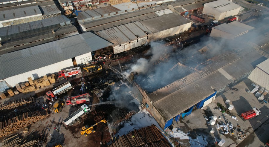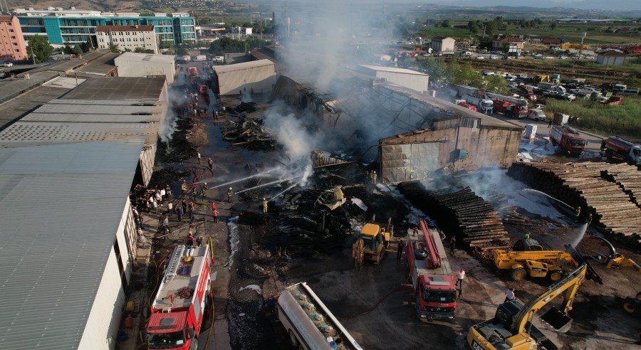 Bursa'nın Yenişehir ilçesinde kereste fabrikasında çıkan yangın rüzgarın da etkisiyle büyüyerek iş yerlerine sıçradı. Yangın ekiplerin erken müdahalesi sonrası kontrol altına alınırken, bölge havadan görüntülendi.