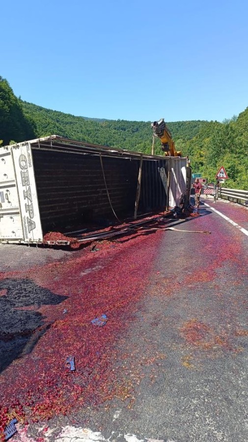 Kamyonun dorsesindeki kirazlar yola saçıldı, sürücüsü yaralandı.
