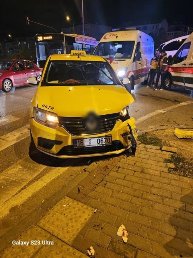 Kaza, merkez Osmangazi İlçesi Gökdere Mahallesi Ali Ferruh Yücel Caddesi üzerinde meydana geldi. Edinilen bilgiye göre, kırmızı ışıkta geçen otomobil, 16 T 0670 plakalı ticari taksiye çarptı.