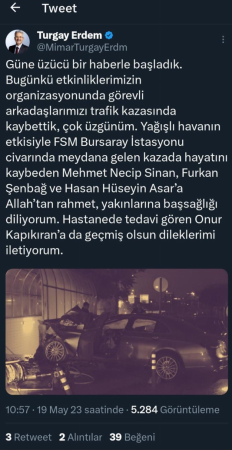 Nilüfer Belediye Başkanı Turgay Erdem, korkunç kazaya ilişkin sosyal medya hesabından kahreden detayı açıkladı. "Güne üzücü bir haberle başladık" diyen Erdem, "Bugünkü etkinliklerimizin organizasyonunda görevli arkadaşlarımızı trafik kazasında kaybettik, çok üzgünüm. Yağışlı havanın etkisiyle FSM Bursaray İstasyonu civarında meydana gelen kazada hayatını kaybeden Mehmet Necip Sinan, Furkan Şenbağ ve Hasan Hüseyin Asar'a Allah'tan rahmet, yakınlarına başsağlığı diliyorum. Hastanede tedavi gören Onur Kapıkıran'a da geçmiş olsun dileklerimi iletiyorum" ifadelerini kullandı.