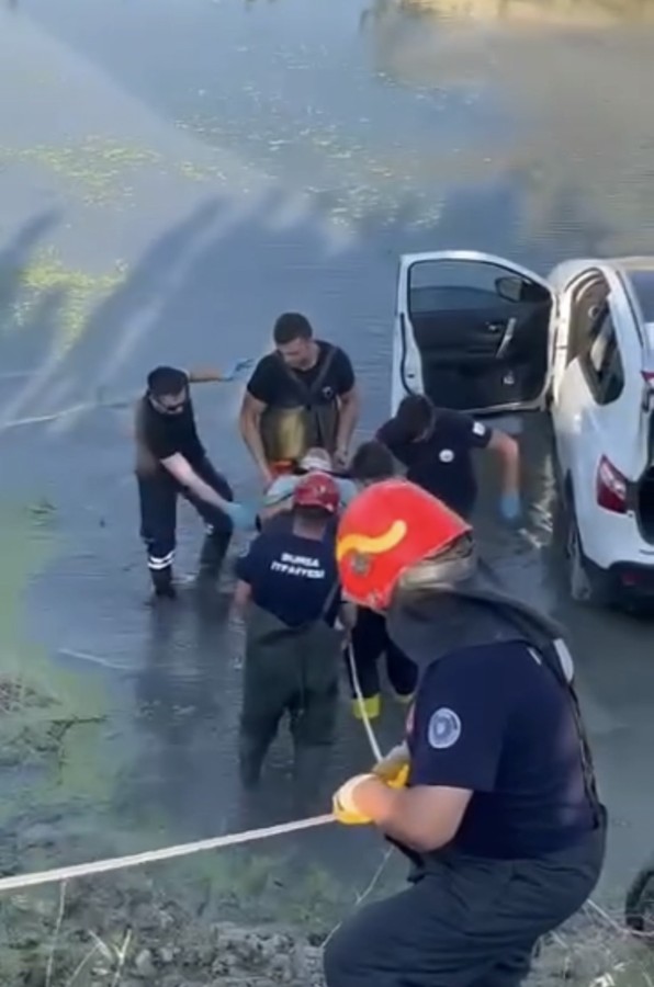 Bursa'da kontrolden çıkan cip, 6 metre yükseklikten dereye uçtu. Kazada araçta sıkışan sürücü itfaiye ekiplerince kurtarıldı.