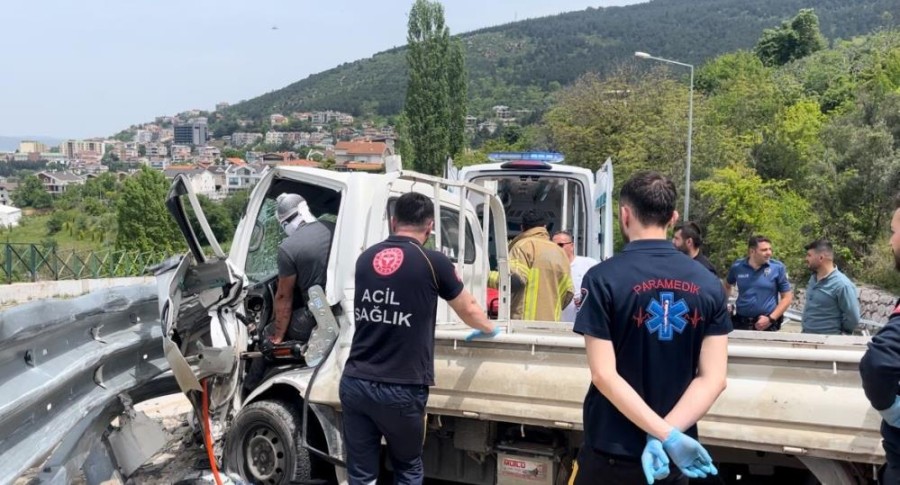 Bursa'da sürücüsünün kontrolünden çıkan kamyonet virajı alamadı. Bariyerlere çarparak duran araç uçurumun eşiğinde kalırken, sıkışan sürücüyü itfaiye ekipleri dakikalarca uğraş sonrası araçtan çıkardı.