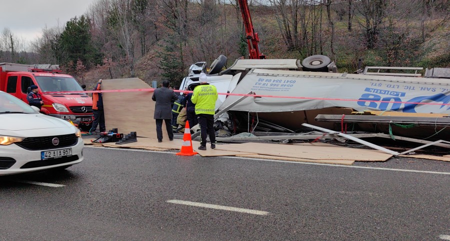 Kaza, saat 16.30 sıralarında Bursa-Ankara karayolu İnegöl'ün Mezit Mahallesi mevkiinde meydana geldi. Eskişehir'den yüklediği suntaları İnegöl'e getirmek üzere yola çıkan Ömer Doğan (59) yönetimindeki 16 PK 936 plakalı tır, virajda sürücünün kontrolünden çıkarak refüje devrildi.