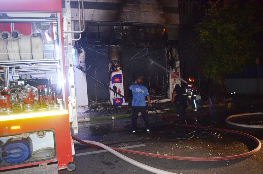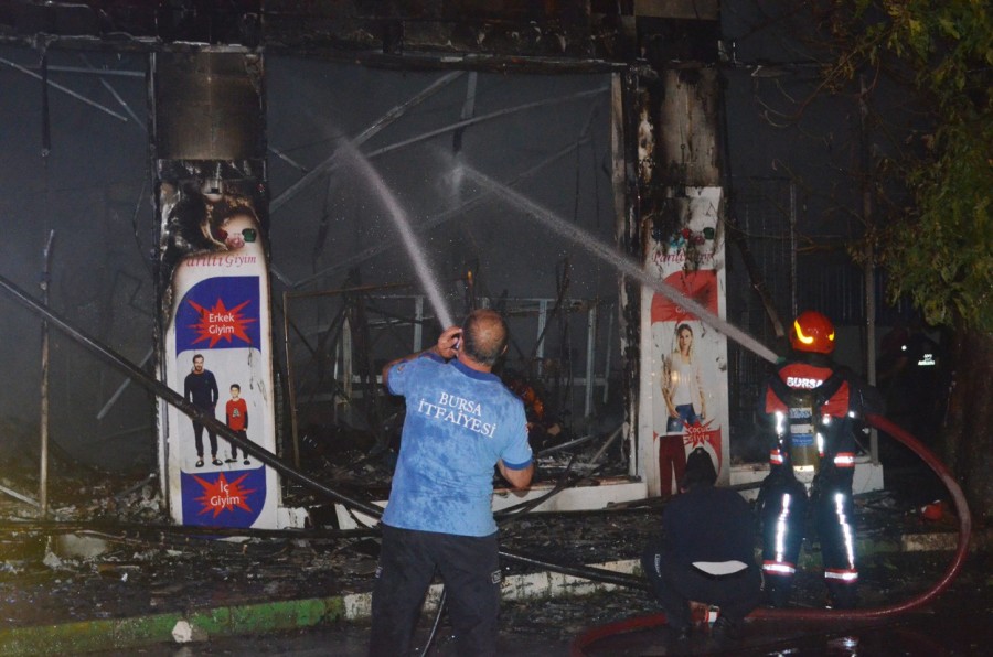 Bursa'nın Mudanya ilçesinde bir giyim mağazasının kundaklanması sonucu çıktığı öne sürülen yangın üst kattaki apartman katlarına sıçradı. Gece yarısı evde uykuda yangına yakalananlar can havliyle alev kapanından kendilerini dışarı attılar. O anlar evden dışarıya çıkan bir kişi tarafından saniye saniye görüntülendi.