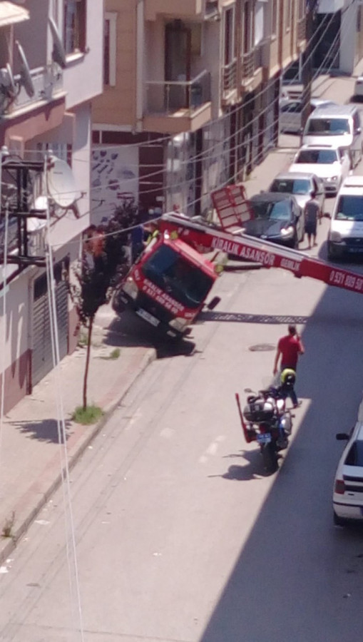 Bursa'nın Gemlik ilçesinde sabah saatlerinde meydana gelen olayda, eşya taşımada kullanılan asansörlü vinç yan yattı. Kazada maddi hasar meydana gelirken, vinç kaza yerinden forklift marifetiyle kaldırıldı.