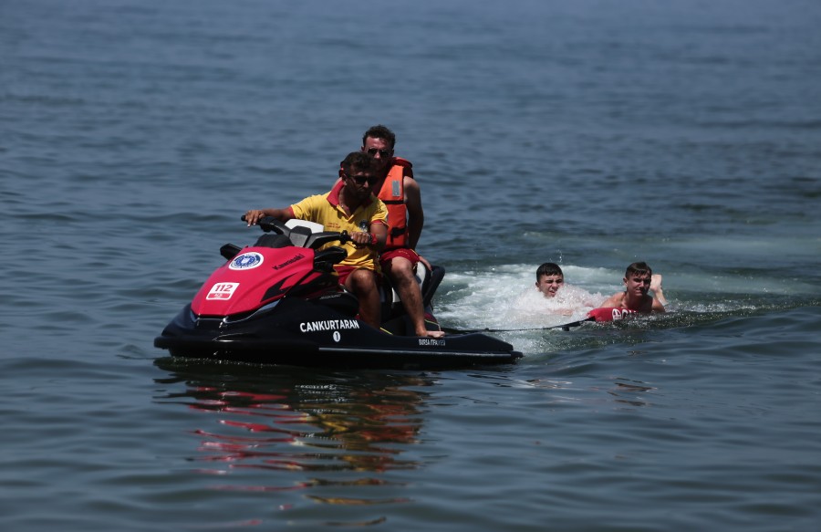 Bursa'nın 19 sahilinde 27 ayrı noktada görev yapan 66 cankurtaran, insanların hayatlarını kurtarmak için kendi canlarını tehlikeye atıyor. Bursa'nın iki mavi bayraklı sahilinden biri olan Karacabey Kurşunlu Halk Plajı'nda yaşanan boğulma vakalarının önüne geçmek için Bursa Büyükşehir Belediyesi'ne bağlı cankurtaran ekipleri tatbikat gerçekleştirdi. Senaryo gereği boğulan iki gence jet ski ile müdahale edilen tatbikat gerçeğini aratmadı.