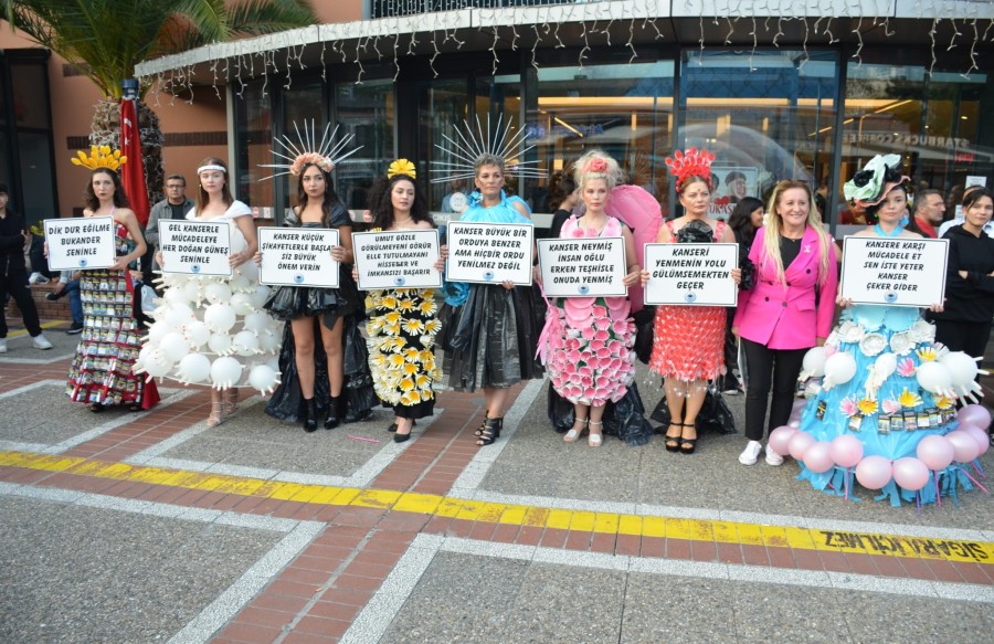 Bursa Kanser Derneği tarafından düzenlenen defilede, kanserojen etkisi bulunan atık maddelerden yapılan giysiler kanser hastası kadınlar ve yakınları tarafından tasarlanıp sergilendi.