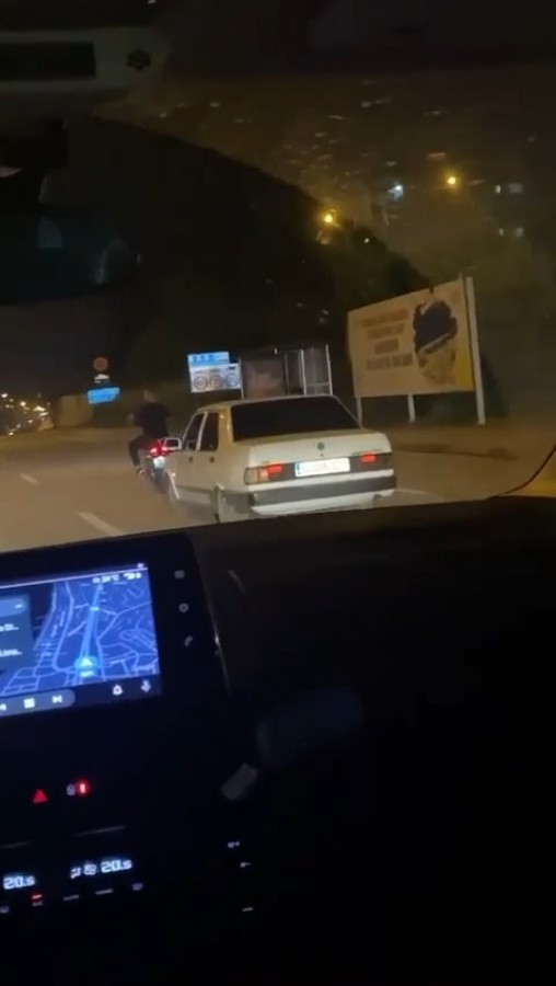 Bursa'da arıza yapan Tofaş marka otomobili motosiklet iple çekti. O anlar trafikteki başka bir sürücünün cep telefon kamerasına yansıdı.