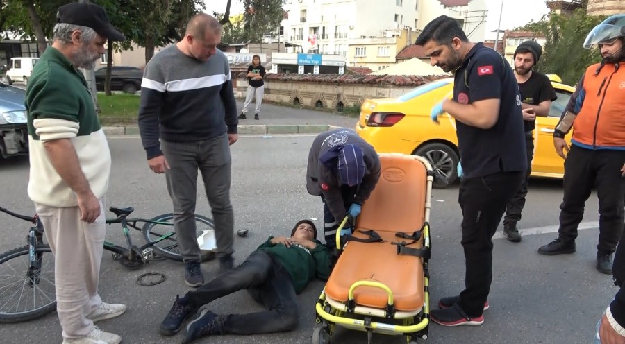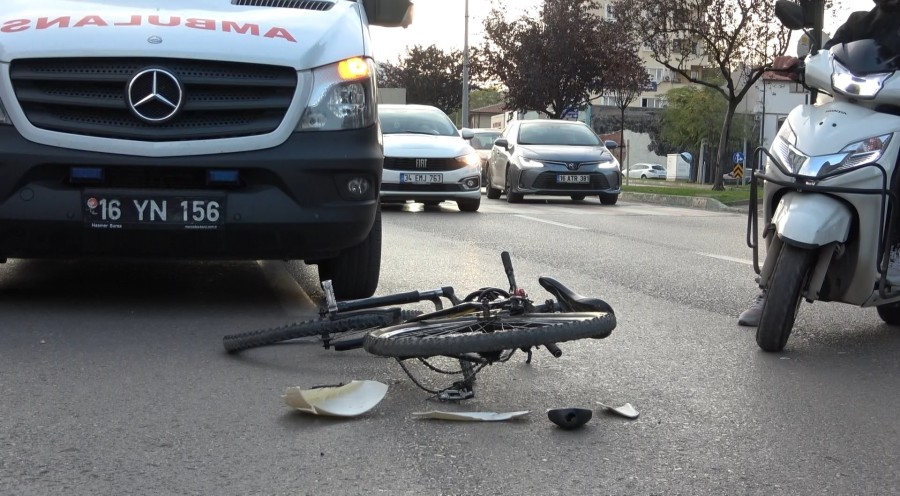 Bursa'da yemek siparişine giden motokurye hızla ilerlerken, karşısına çıkan bisikletli çocuğa çarptı. Yaralı çocuk kaza yerine gelen babasını sakinleştirirken, telefonla arayan annesine de "Ben iyiyim, sen üzme kendini anne" dedi. O anlar kameraya anbean yansıdı.