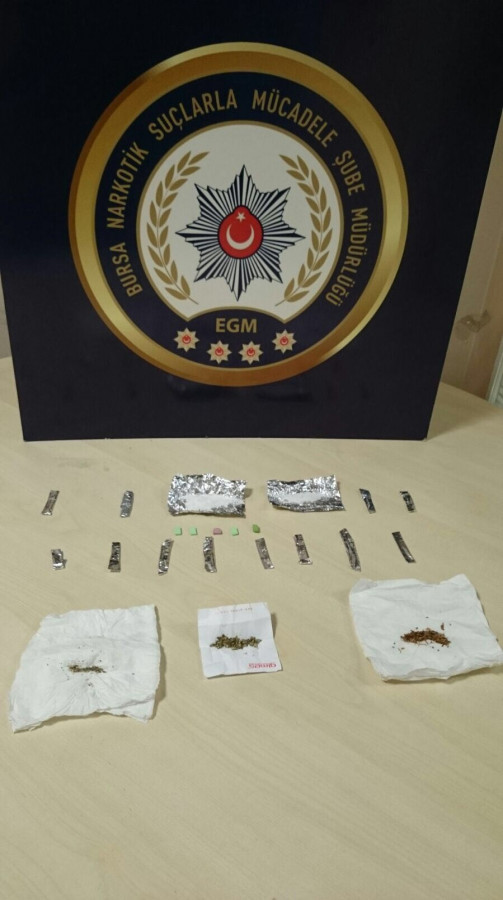 Bursa merkez Osmangazi ilçesi Bağlarbaşı Mahallesi Hürriyet Caddesi üzerinde şüpheli aracı durduran narkotik ekipleri, araç içerisindeki Y.S., A.A., M.E., G.A. isimli şahısların üzerinde ve bulunduğu araçta arama yaptı. Yapılan aramalarda bir miktar sentetik kannobinoid, bir miktar esrar ile çok sayıda ecstasy hap ele geçirildi.
