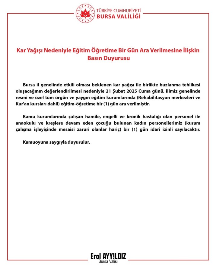 "Bursa il genelinde etkili olması beklenen kar yağışı ile birlikte buzlanma tehlikesi oluşacağının değerlendirilmesi nedeniyle 21 Şubat 2025 Cuma günü, ilimiz genelinde resmi ve özel tüm örgün ve yaygın eğitim kurumlarında (Rehabilitasyon merkezleri ve Kur'an kursları dahil) eğitim-öğretime bir 1 gün ara verilmiştir. Kamu kurumlarında çalışan hamile, engelli ve kronik hastalığı olan personel ile anaokulu ve kreşlere devam eden çocuğu bulunan kadın personellerimiz (kurum çalışma işleyişinde mesaisi zaruri olanlar hariç) bir 1 gün idari izinli sayılacaktır."