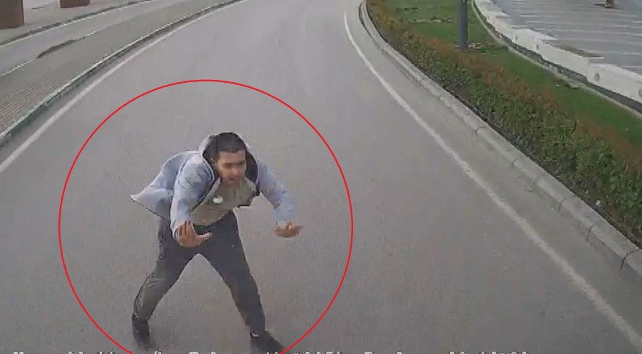 Bursa'da tartıştığı taksicilerden kaçan genç, koşarak belediye otobüsünün önüne atladı. Yolcu dolu otobüsün şoförü ise aniden fren yaparak genci mutlak ölümden kurtardı. Başını otobüsün camına çarparak yere düşen genç kazayı hafif sıyrıklarla atlattı. Kaza anı kameraya yansıdı.