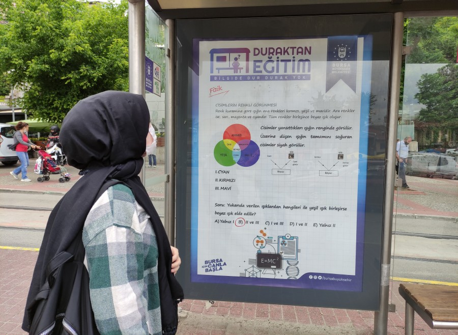 Bursa Büyükşehir Belediyesi, örnek bir çalışmaya imza attı. Şehrin bir çok noktasında bulunan otobüs duraklarına öğrenciler otobüs beklerken ders çalışsın diye belediye tarafından ders notları asıldı. Otobüs bekleyen öğrenciler, zamanlarını otobüs duraklarında ders çalışarak geçiriyor. Bu uygulamadan memnun olan öğrenciler, ders notlarının şehrin bütün duraklarına yazılmasını istedi.