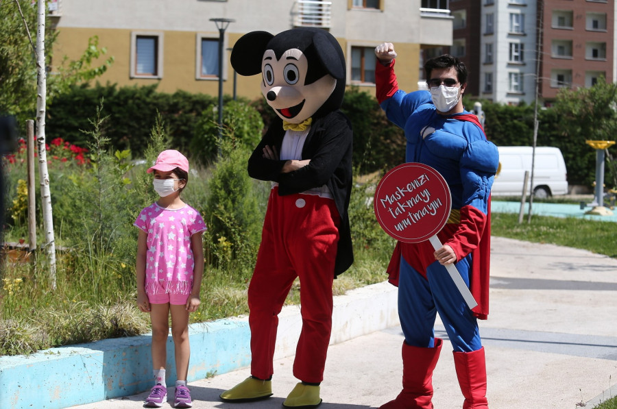 Bursa'da 0-14 yaş çocuklar sokağa çıkma izninde parkları doldurdu. 'Süper Kahramanlar' kıyafetli gençler de maske dağıtarak çocukları eğlendirirken, sık sık sosyal mesafe hatırlatmasında bulundu. Çocuklar parklardaki oyun aletlerine sosyal mesafeye uyarak bindi.