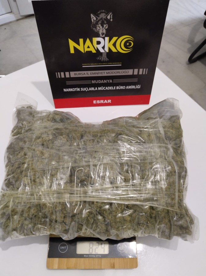 Mudanya İlçe Emniyet Müdürlüğü Narkotik Şube ekipleri, gece saat 03.00 sıralarında şok uygulama yaptı. Uygulama sırasında Güzelyalı Burgaz Mahallesi Şehit Mehmet Caddesi üzerinde motosikleti ile polislerden kaçmak isteyen T.Y. yakalandı. Şüphelinin üzerinde yapılan aramada 824 gram esrar maddesi ele geçirildi.