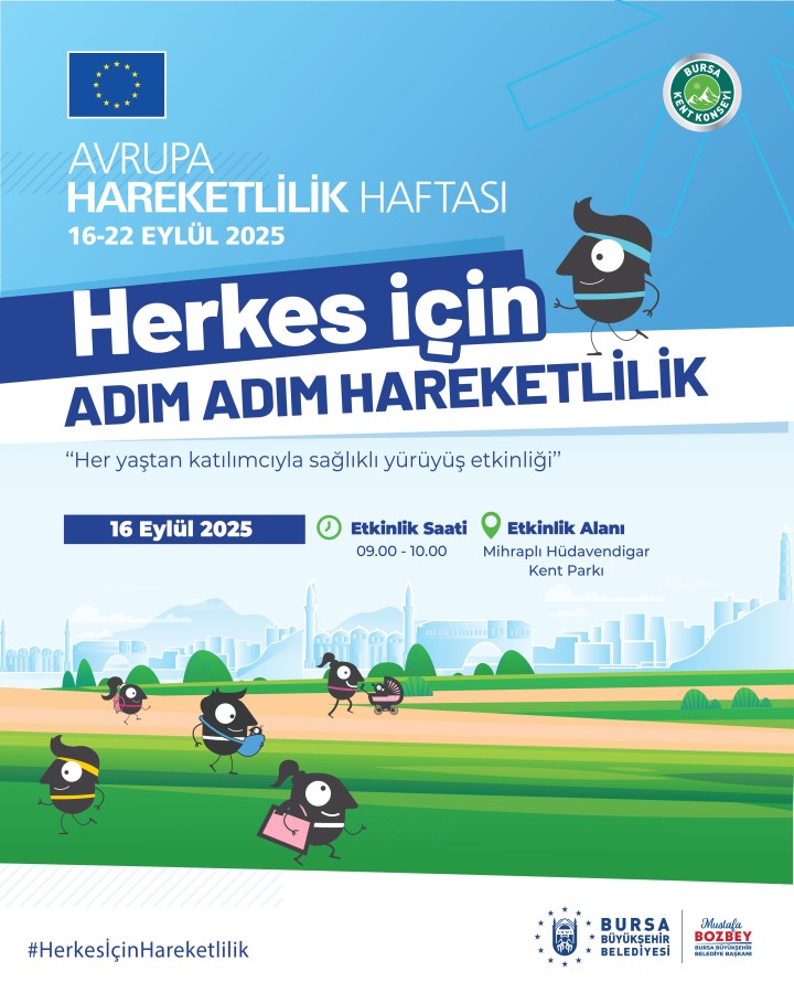 Dünya kentleriyle eş zamanlı olarak Bursa'da da kutlanmaya başlayan Avrupa Hareketlilik Haftası, Mihraplı Hüdavendigar Kent Parkı'nda düzenlenen "Herkes için adım adım hareketlilik" etkinliğiyle start aldı. Hafta boyunca yürüyüşten bisiklete, spor ve sanat faaliyetlerinden doğa etkinliklerine kadar birçok program gerçekleştirilecek.