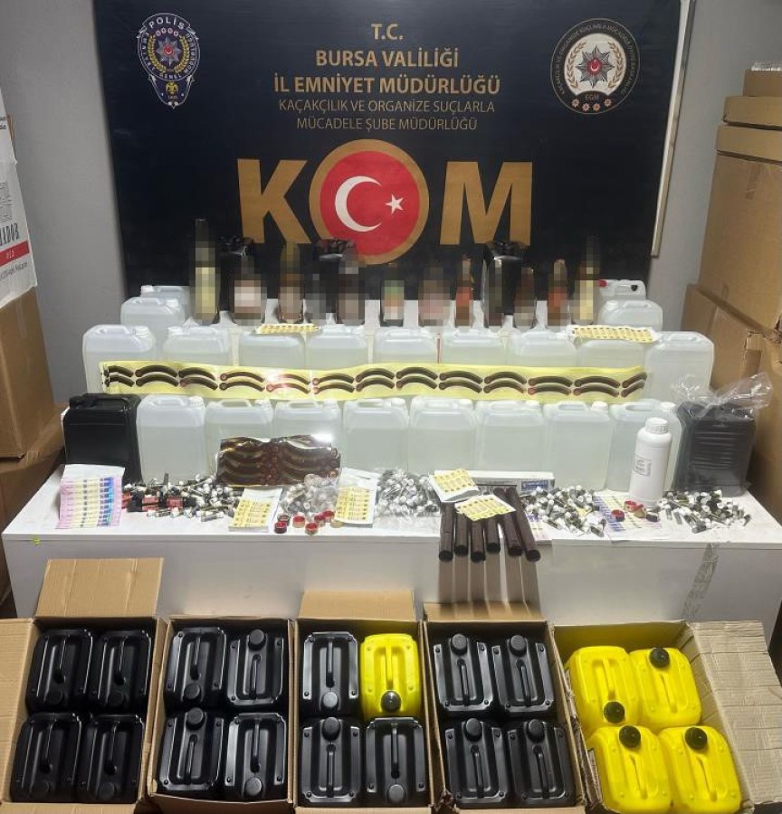 Bursa Cumhuriyet Başsavcılığı koordinesinde Bursa Kaçakçılık ve Organize Suçlarla Mücadele Şube Müdürlüğü ekipleri sahte alkollü içki imalatı ve ticareti yapan şahıslara yönelik operasyon düzenledi.