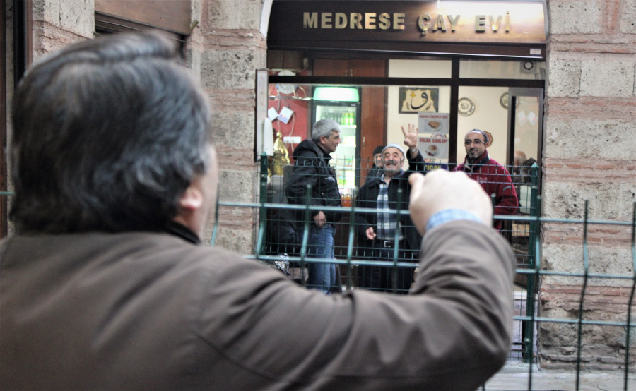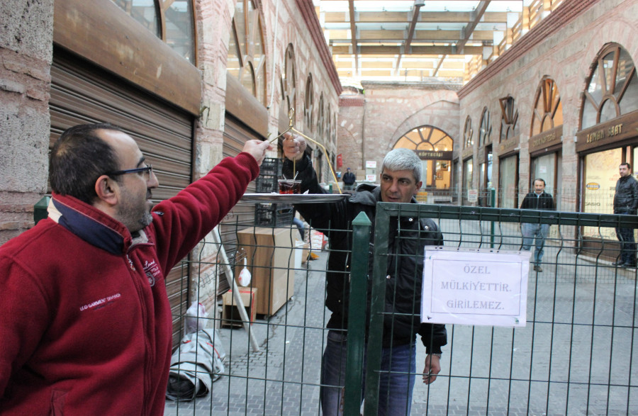Bursa'da Ulucami yanındaki 600 yıllık tarihi hanın yolu tel örgüyle kapatıldı. Yolu kapanan esnaf, tel örgülerin ardından birbiriyle konuşuyor.