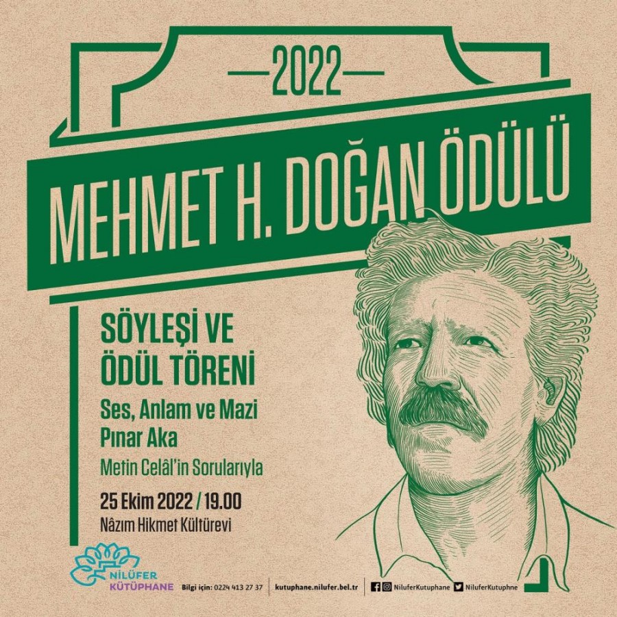Nilüfer Belediyesi Kütüphane Müdürlüğü aynı gece, Türkçede yayımlanmış şiir eleştirilerinin önemine dikkat çekmek ve Türk şiirine katkı sunmak amacıyla düzenlediği Mehmet H. Doğan Ödül törenini de gerçekleştirecek. Tören Nâzım Hikmet Kültürevi'nde, saat 19.00'da düzenlenecek. Bu yıl 6. kez düzenlenen Mehmet H. Doğan Ödülünü "Ses Anlam ve Mazi : Etkilerin Kavşağında Yahya Kemal Şiiri" adlı kitabıyla kazanan Pınar Aka, ödülünü aldıktan sonra da Metin Celal'ın sorularıyla söyleşi gerçekleştirilecek.