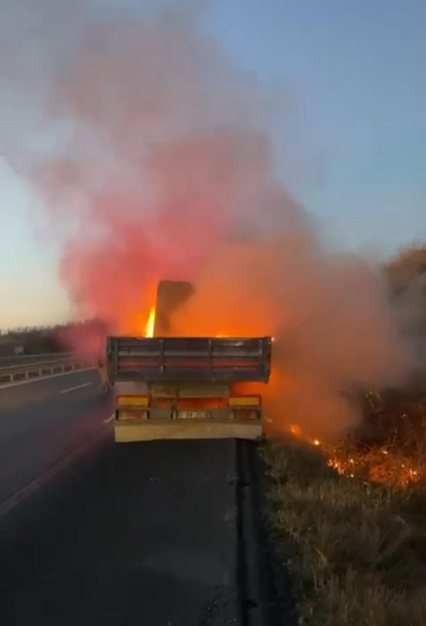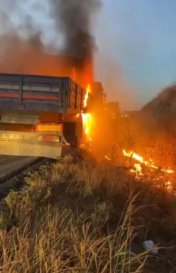 Sürücünün durumu fark etmesiyle araç hemen kenarı çekildi. Hızla büyüyen alevler tırdan anayoldaki otluk alana sıçradı.