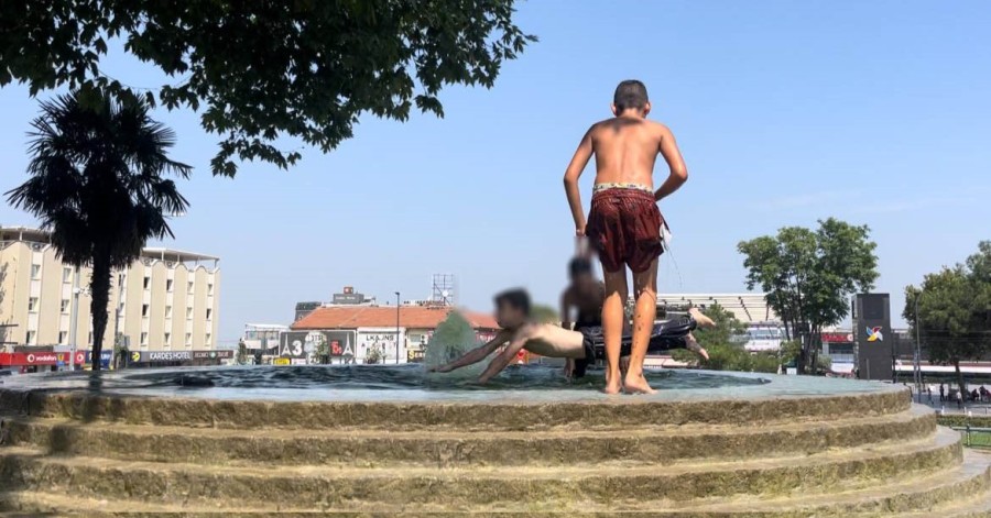 Bursa'nın merkez Osmangazi ilçesi Santral Garaj Mahallesi'nde sıcaklardan bunalan çocuklar çareyi süs havuzunda buldu.