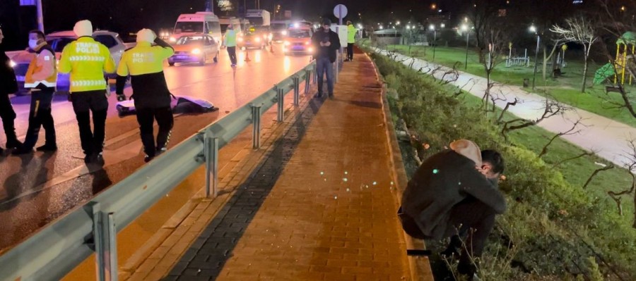 Bariyerlere savrulan motosikletli başını bariyerlere çarpıp metrelerce savruldu. Hemen arkasından motosikletiyle gelen arkadaşı kazayı görünce hemen yardıma koştu.