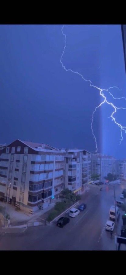 Gökyüzünden neredeyse yere kadar uzanan şimşek gecenin karanlığını aydınlığa çevirdi