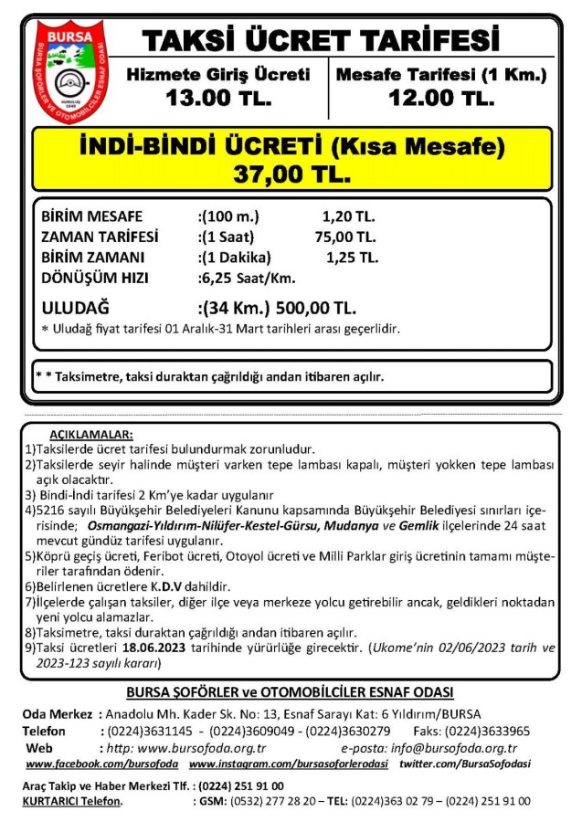 Bursa Şoförler ve Otomobilciler Esnaf Odası tarafından yapılan açıklamada, indi-bindi 37 TL, birim mesafe (100 metre) 1,20 TL, zaman tarifesi (1 saat) 75 TL, birim zamanı (1 dakika) 1,25 TL oldu. Taksi ile Uludağ'a çıkma ise 500 TL'ye yükseldi.